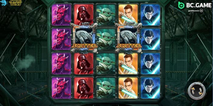 At the core of the gameplay is the Star Duel mechanic. After a winning spin completes its cascades, a duel between the light and dark sides may be triggered, with the winning faction activating a special power that reshapes the reels. These powers can include transforming symbols into mystery symbols, clearing symbols from the grid, generating cash symbols, triggering cash spins or boosting multipliers, and adding further variation to each round.