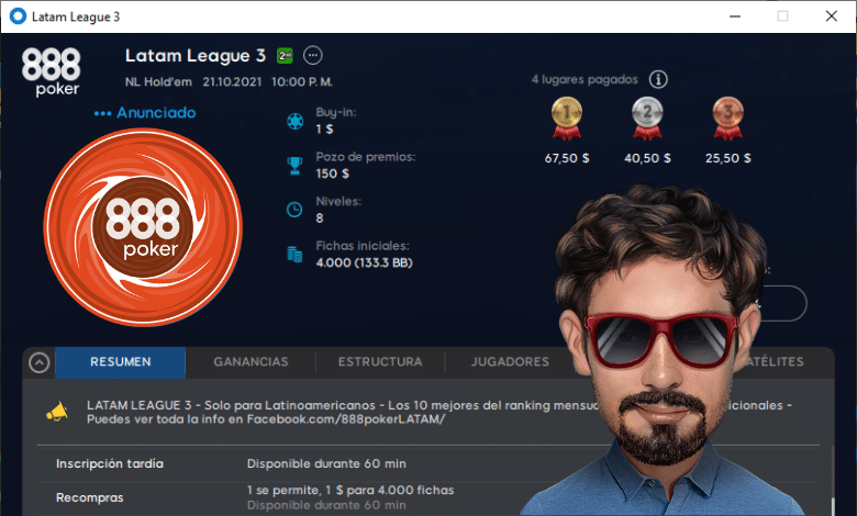 Hoy Miércoles es la previa de la fecha LATAM LEAGUE 21o en 888Poker, con el FREEROLL QUALY que ahora clasifica a 50 jugadores a la fecha de los Jueves por los puntos del ranking. La otra novedad es que ahora es de u$s 150 el premio garantizado de cada torneo.