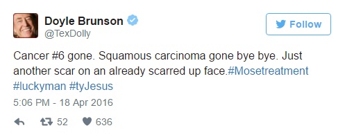 «Cancer #6 desaparecido. Carcinoma escamoso desaparecido, adiós. Solo otra cicatriz en mi ya muy cicatrizada cara. #hombreconsuerte #tyJesus»