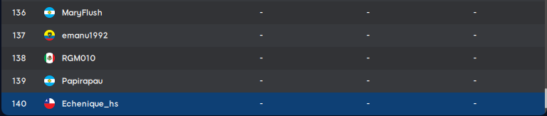 | 32 | pichonazo024 | BOL | 116 | 142 | 45 | 303 | |