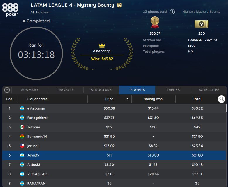 fue el campeón de la última fecha de esta LATAM LEAGUE en 888Poker. Este cierre lo catapultó a «Big_Dice_75″ como ganador del Ranking Mensual y el ticket de u$s 109.