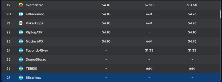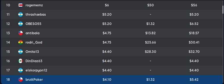 | 213 | myopoker | ARG | 5 | 1 | 6 | ||