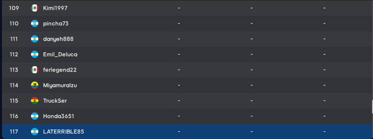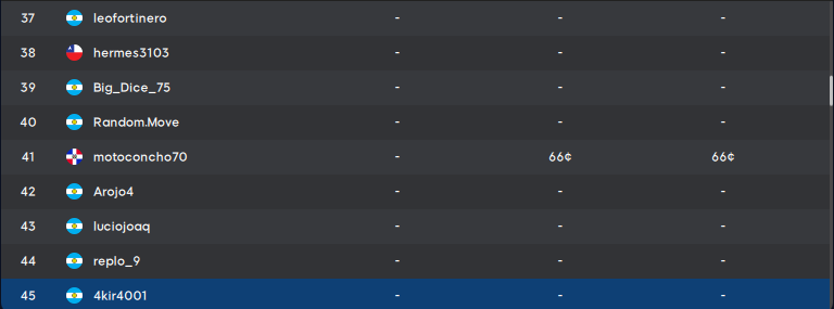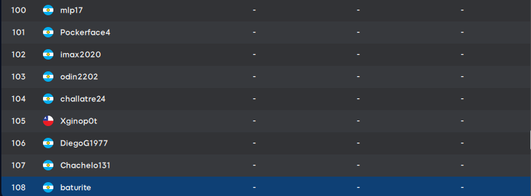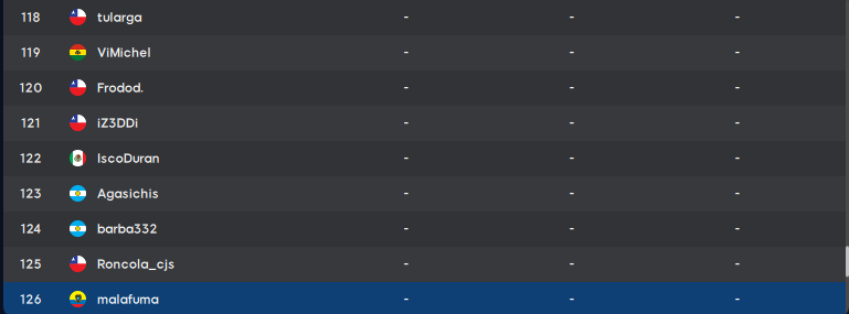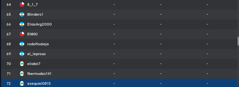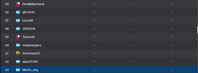 | 63 | Matiasb93 | ARG | 83 | 36 | 118 | 237 | |