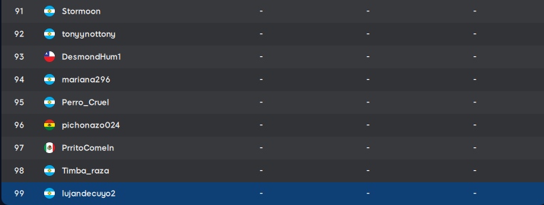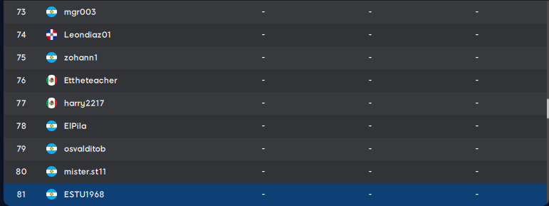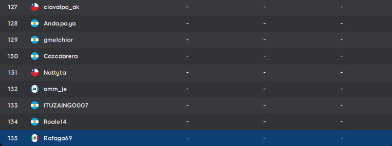 | 88 | pincha73 | ARG | 33 | 81 | 40 | 31 | 189 |