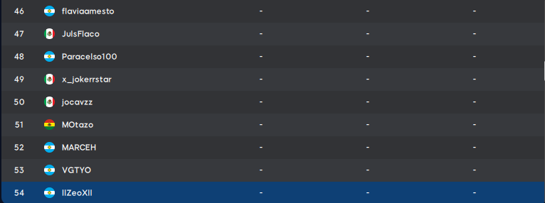 | 47 | ferlegend22 | MEX | 54 | 112 | 66 | 28 | 264 |