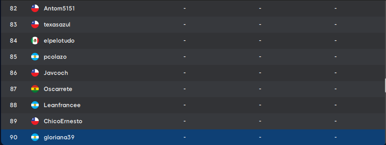 | 32 | pichonazo024 | BOL | 116 | 142 | 45 | 303 | |