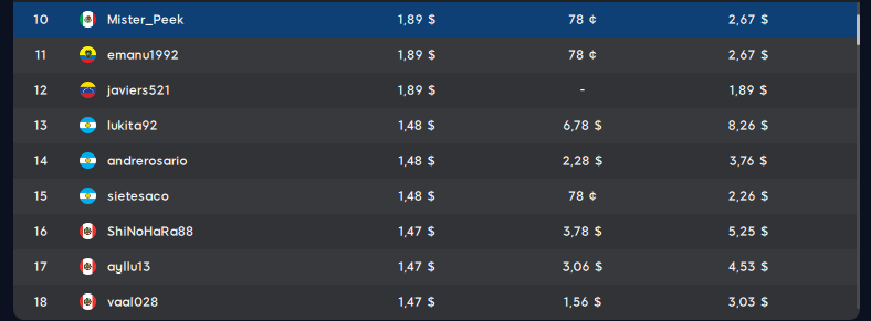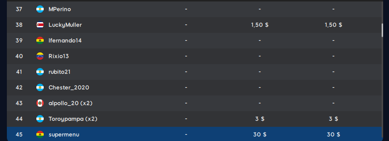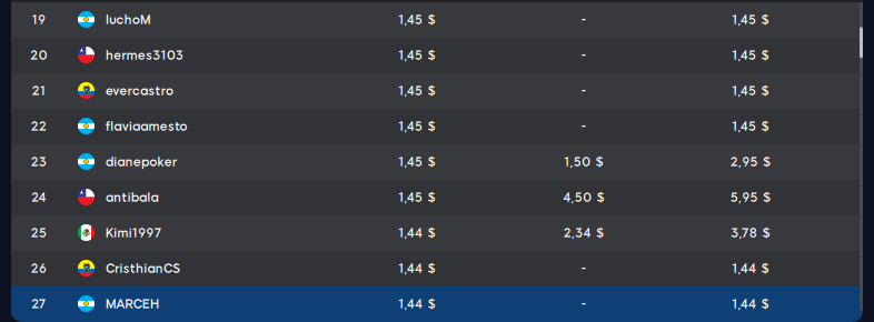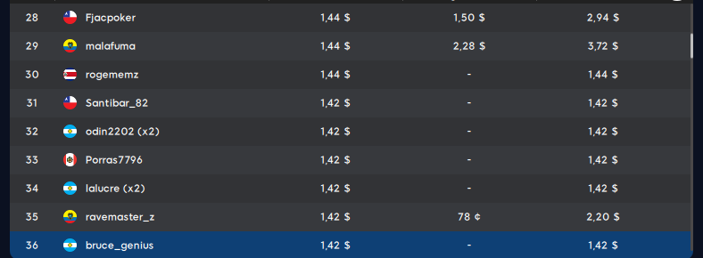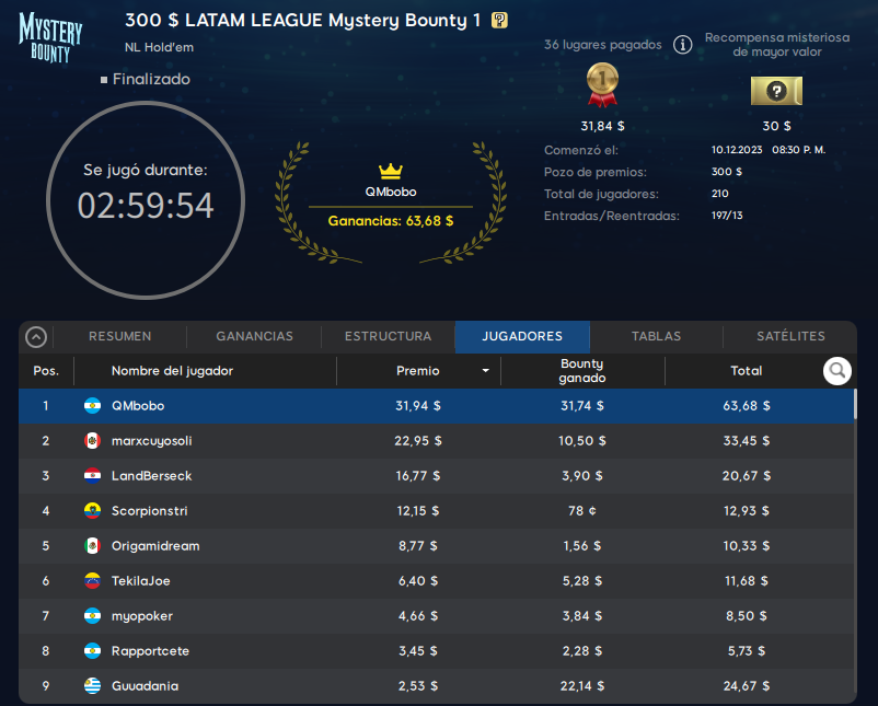 El campéón argentino supero en el Heads up a «marxcuyosoli» de Perú. El tercer puesto quedó en manos de «LandBerseck» de Paraguay. El dato de color es que «supermenu» de Bolivia terminó en el puesto 45 obteniendo un sobre Mystery Bounty de u$s 30, felicitaciones!