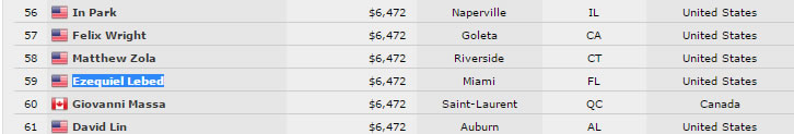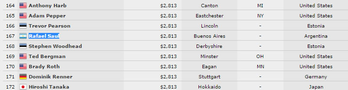 Argentina sigue su camino de cobros en la WSOP, con dos nuevos representantes entrando In the Money esta vez en el Evento #20 NLH de U$S 1500: Rafael Saúl (167°) y Ezequiel Lebed (59°) pudieron atravesar el campo de 1844 inscriptos para cobrar U$S 2813 y U$S 6472 respectivamente. Lamentablemente nuestro capitán Marcelo Stones cayó cerca de la burbuja cuando sus K-K fueron quebrados por los 10-10 de su rival.