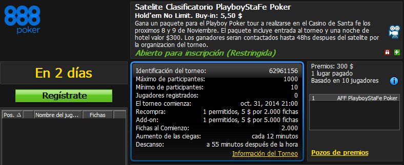 888Poker invita a sus jugadores a participar de satélites clasificatorios para el torneo Playboy Poker en el Casino de Santa Fe los días 31 de Octubre y 2 de Noviembre a las 21 HS local, por un valor de U$S 5.50.