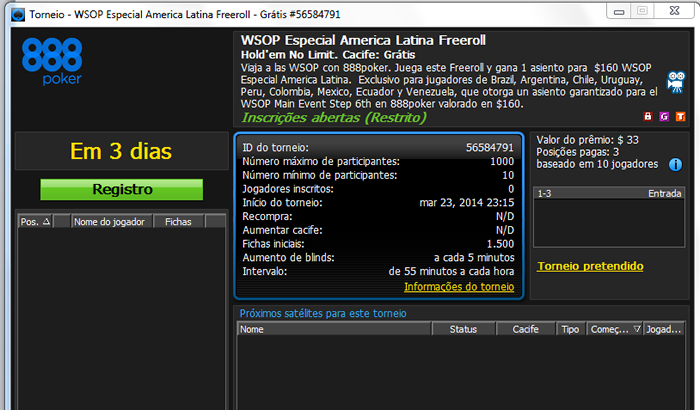 Wsop Freeroll especial America Latina (Otorga 3 asientos valor de cada asiento $11)