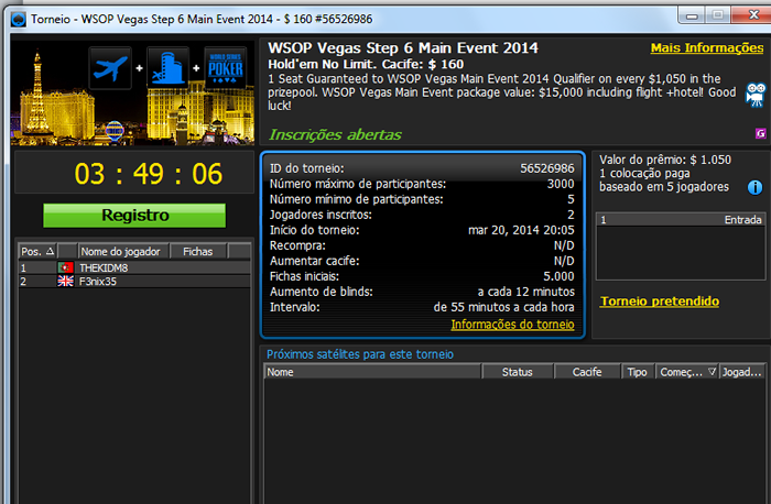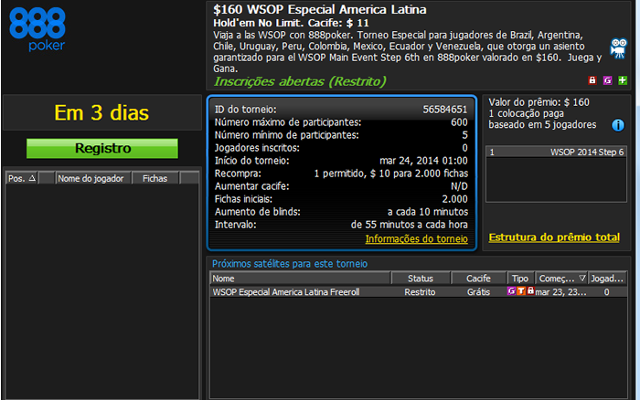 $160 WSOP Especial America Latina Buy in de $11 (otorga un asiento garantizado de $160)
