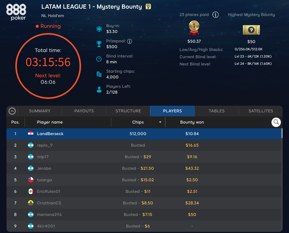 consiguió la primera fecha para Paraguay en el comienzo de un nuevo mes de competencia LATAM LEAGUE en 888Poker. En el heads up superó al argentino «replo_9»