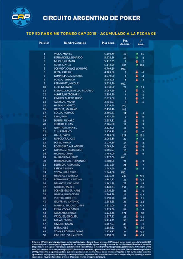 La quinta fecha del Circuito Argentino de Poker coronó a Matías Ruzzi como campeón luego de que venciese a Carlos Schmidt en el HU para llevarse un millonario premio. Pero el ranking del circuito, que antes tenía como sólido líder a Germán Muisés (bicampeón este año) ahora ve a Andrés Viola en la cima seguido por Leo Fernandez Galle en segundo lugar y a Muisés tercero.