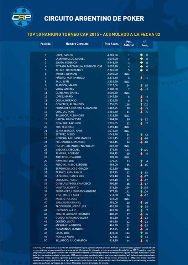 El Circuito Argentino de Poker ya tiene un ranking actualizado de sus jugadores a la 2da fecha: luego de la coronación de Fernando di Francesco el año pasado como jugador de la serie, el puesto para este 2015 estará en la contención. Quien lidera el ranking hasta ahora es Carlos Leiva, campeón en Madero de la 1era fecha. Estas son las posiciones:
