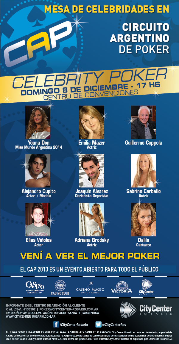 Se viene la Gran Final del Circuito Argentino de Póker 2013 que se disputará en City Center Rosario desde el 07 al 10 de diciembre en el Centro de Convenciones. En el marco del mejor circuito de poker del país, que ya cuenta con más de 500 inscriptos, el domingo 08/12 a las 17 horas se desarrollará una mesa de Celebrity Póker. A los ya anunciados Guillermo Cóppola y la cantante Dalila se le sumaron las reconocidas actrices argentinas Adriana Brodsky, Emilia Mazer, Sabrina Carballo; el modelo y actor Alejandro Cupito; el actor Elías Viñoles; el periodista deportivo Joaquín Álvarez y la flamante Miss Mundo Argentina 2014 Yoana Don.