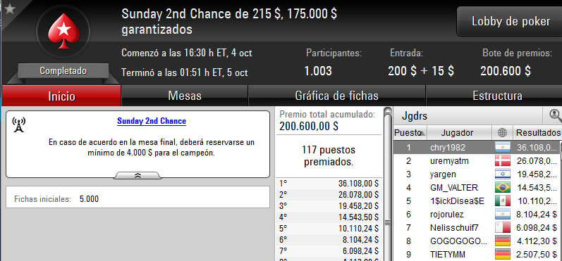 Como cada fin de semana los torneos dominicales en PokerStars hacen girar cabezas, con campeones atrapando grandes premios y nuevos victores emergiendo. Esta ocasión hubo un representante argentino en la tapa de los resultados: Christian «chry1982» Sare se quedó con el torneo Sunday Second Chance de U$S 215 para atrapar un primer premio de U$s 36.108. El torneo contó con las presencias de jugadores como Andrey Pateychuk, Martin Jacobson, Mike Mc Donald y Eugene Katchalov entre los inscriptos, y tuvo en la mesa final la participación de otro argentino: Franco «rojorulez» Spitale, quien terminó 6to por U$s 8.104.