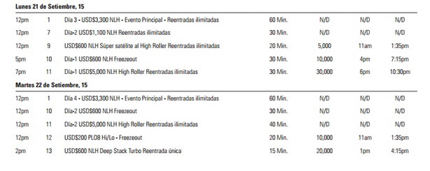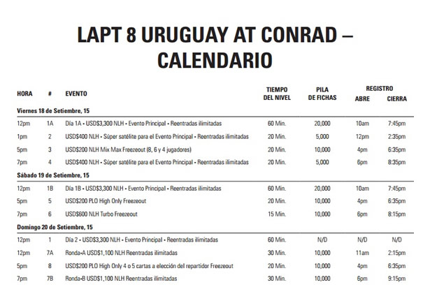 Así será el calendario de acciones para esta nueva fecha del LAPT en el Enjoy Conrad, del 23 al 27 de Septiembre: