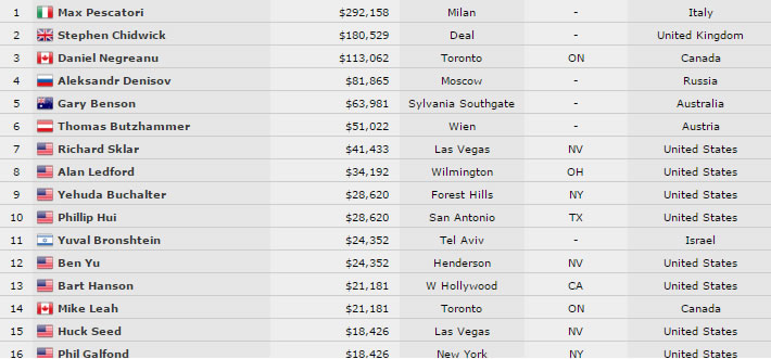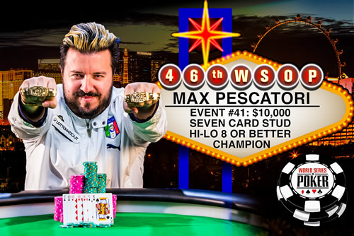 Otro jugador repite un triunfo en esta WSOP: el italiano Max Pescatori atrapó su 2ndo brazalete tras ganar el Evento #41 Seven Card Stud por U$S 292.158, casi 20 días luego de su victoria en el Evento #9 Razz. Este es entonces su 4to brazalete en total, y 2do en esta serie, hazaña que comparte por ahora solo con Brian Hastings.