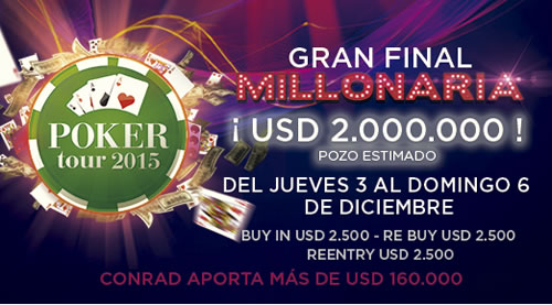 El año 2015 va encontrando su cierre, y así lo tendrá también el Conrad Poker Tour que llegará a su Gran Final Millonaria la semana que viene. La fecha de inicio será el Jueves 3 de Diciembre y cerrará el Domingo 6. El pozo estimado de U$S 2.000.000 tendrá aportes de U$S 160.000 del Conrad. Estas serán las características del torneo: