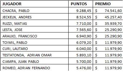 Luego de seis fechas de Master Cup Hunters, Pablo Chacra se consagró campeón del año y se hizo acreedor de un premio de $74.541,60, seguido por Andrés Jeckeln que por su segundo puesto se lleva $45.257,40 y Matías Ruzzi que por completar el podio recibe $35.939,70. El ganador de la última fecha, José Lesta, se ubica en cuarta posición.