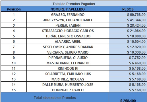 Fernando Grasso se quedó con la primera posición seguido por Luciano Jurczysyn Fabián Perier haciéndose acreedores de $ 69.768, $ 41.344 y $ 28.424 respectivamente.
