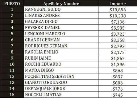 Guido Rangugni se quedó con la primera posición seguido por Andrés Linares y Diego Galarza haciéndose acreedores de $ 19.856, $ 10.238 y $ 7.136 respectivamente.