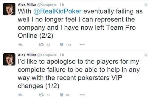 Ahora la crisis se ha cobrado a un Team Pro Online: el jugador Alex «Kanu7» Millar decidió renunciar a su puesto dentro de la sala de la pica roja y sus razones fueron más que convincentes. «Quisiera disculparme a los jugadores por mi completa inanición para ayudar a los jugadores con los recientes cambios VIP en el sitio. Con Daniel Negreanu eventualmente fallándonos como representante también, no siento que puedo representar a PokerStars y decidí abandonar al Team Pro»