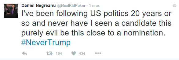Negreanu es una de las tantas personas enfrentadas ideológicamente a Donald Trump, mencionando que un voto al millonario republicano es un voto para la «muertes de mujeres y niños a manos terroristas», incluso aludiendo al hashtag #NeverTrump (Nunca Trump) que se asemeja a uno visto en estas tierras. Para Daniel, esta apuesta tiene un toque personal. ¿Se le animan?