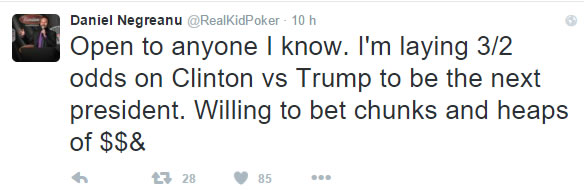 Negreanu, que ha estado siempre activo en discusiones políticas, mantiene que el próximo presidente de EEUU será Hillary Clinton y ofrece odds de 3/2 que su candidata vencerá a Donald Trump. No solo impone odds suculentas, sino que parece bastante confiado ya que está dispuesto a poner «montones y pilas de $$$».