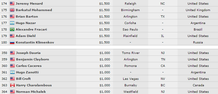 Así, con este formato novedoso de cobros hubo representación argentina de parte de dos jugadores en el Evento: Hugo Nazar y Hugo Zanotti lograron acceder ITM. Nazar finalizó en 177 posición para recuperar lo invertido, mientras Zanotti terminó 361 para cobrar U$S 1000, el mínimo.