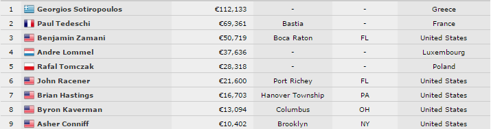 Por el otro lado el griego Georgios Sotiropoulos alcanzó el brazalete del Evento #8 NLH Turbo con Re-entry, ganando €112.133 de premio. Este es el tercer brazalete para un griego en la serie, con Avramidis llevándose el evento inaugural y Xanthopoulos ganándole el HU a Mario «medmar López» en el Evento #6. Para ganar este torneo, Sotiropoulos tuvo que vencer a bestias del fieltro como Brian Hastings, Greg Merson, Fedor Holz, Shaun Deeb y David ODB Baker entre otros. Así cerró el Evento, con estos 9 jugadores y sus cobros en la Mesa Final: