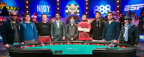 Asiento Jugador País Stack Odds 1 Zvi Stern Israel 29,800,000 4/1 2 Pierre Neuville Bélgica 21,075,000 6/1 3 Josh Beckley EEUU 11,800,000 12/1 4 Max Steinberg EEUU 20,200,000 12/1 5 Thomas Cannuli EEUU 12,250,000 7/1 6 Joseph McKeehen EEUU 63,100,000 7/5 7 Patrick Chan EEUU 6,225,000 25/1 8 Federico Butteroni Italia 6,200,000 25/1 9 Neil Blumenfield EEUU 22,000,000 6/1