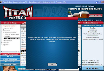 Les comento algunas curiosidades que me ocurrieron en estos días en lo que se refiere a salas y monederos en EEUU. Por ejemplo: Titan Poker no me deja jugar por dinero real y me enseña la imagen que les adjunto, por otro lado PokerStars me deja operar sin problemas. Neteller esta restringido según su suporte en linea, ni siquiera entre por que me avisaron que me bloquearían la cuenta si lo hiciera, lo curioso es que Moneybookers lo estoy usando sin inconvenientes.