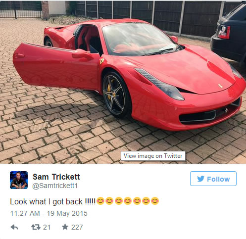 No hace mucho Sam Trickett había hecho público el accidente sufrido al volante de su Ferrari, que aunque no le trajo ningúna lesión, le dejó el auto en un estado más que deplorable. Fanático de los autos y con ganancias millonarias en su historial de juego (incluidos un 2do lugar en el Big One for One Drop 2012), se pudo permitir esto gustos: