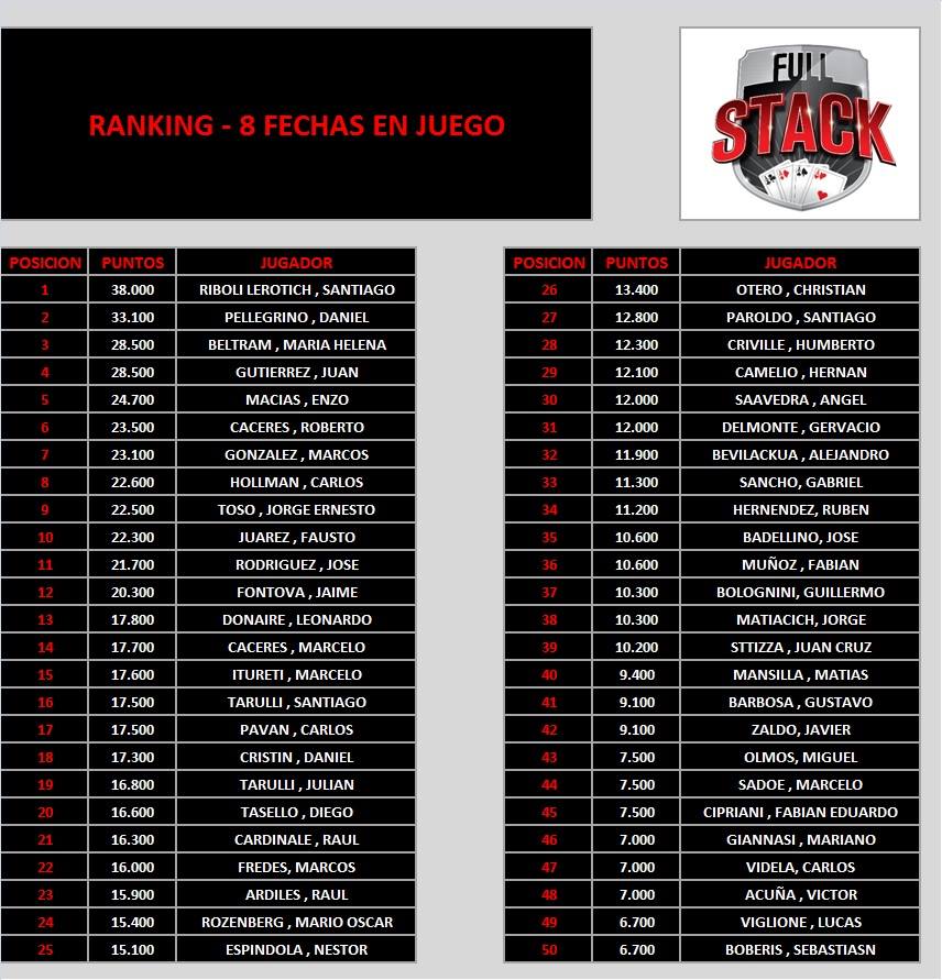 Y así quedó el ranking general del FullStack luego de su octava jornada. Hoy desde las 19:00 hs se realiza la 9na fecha del torneo: