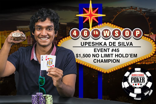El Evento #45 finalizó hoy en Las Vegas, coronando al joven tejano Upeshka Desilva con U$S 424.577 por su primer lugar. Con esta victoria Desilva triplica sus ganancias en la WSOP y consigue su primer brazalete de la serie.