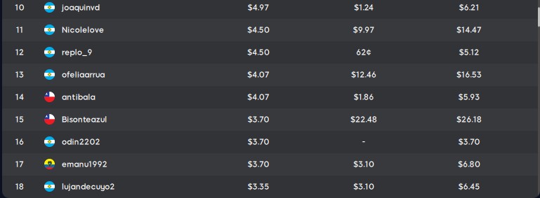| 36 | Leanfrancee | ARG | 0 | 0 | 0 | 19 | 19 |