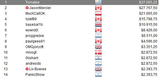 El uruguayo Francisco «tomatee» Benítez se hizo notar en esta serie WCOOP en PokerStars: luego de finalizar 5to en el Evento 25 por U$S 263.500, pudo darse revancha y se quedó con el triunfo en el Evento #31 WCOOP 2nd Chance: $530 NL Hold’em. Para llegar a la cima, debió vencer a varios jugadores de la élite del poker online: Liv Boeree, Bryn Kenney, Joaquín Melogno, Chris Moorman y Bertrand Grosspellier entre otros, incluido a Jason Mercier que fue su rival en el HU.