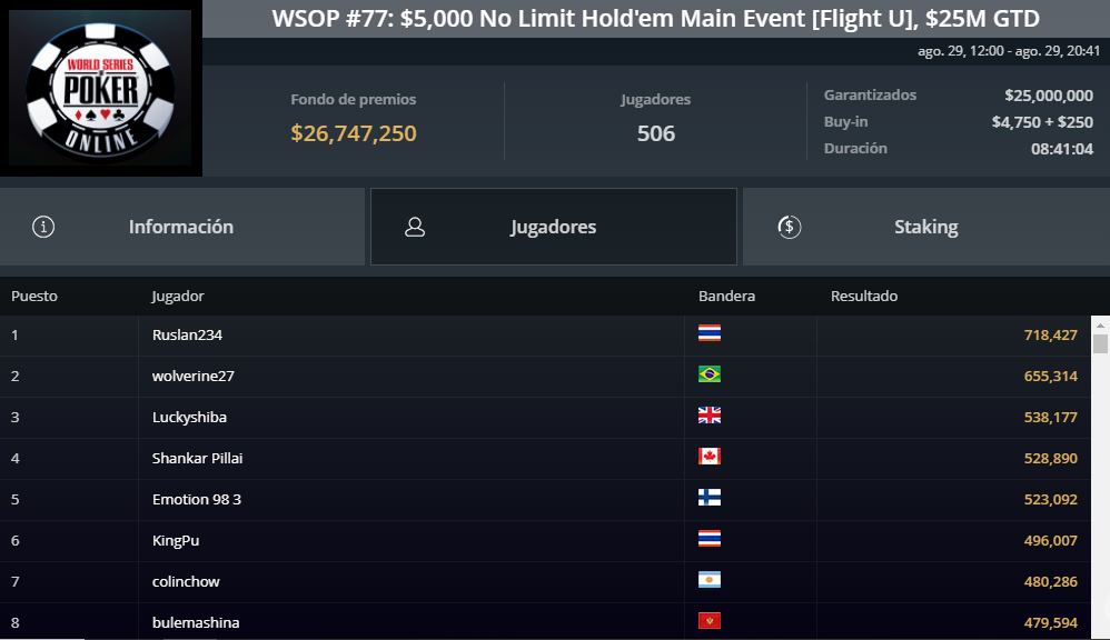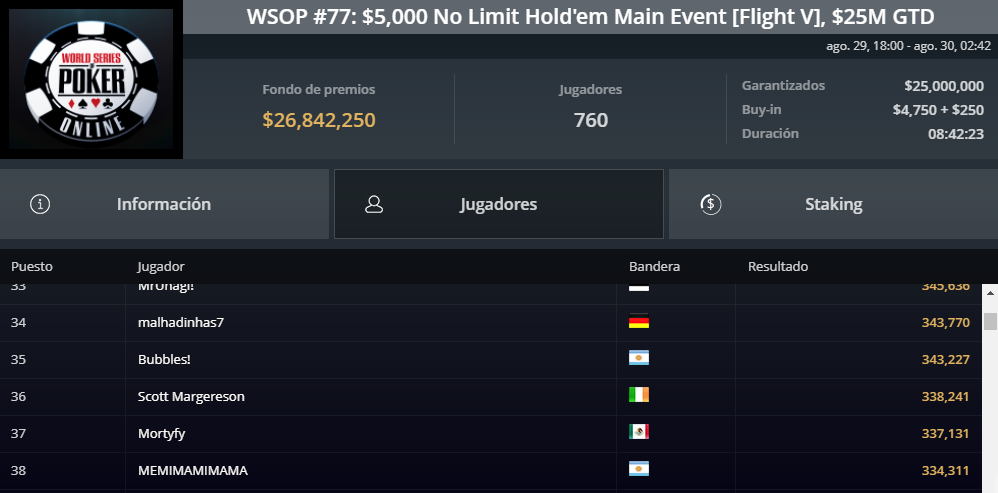 El Domingo 30 de Agosto se jugará el segundo día de competencia del Main Event 5K, el torneo más importante de la WSOP Online que se está llevando a cabo en la sala GGPoker. Por ahora son 22 los jugadores argentinos que siguen en carrera a falta de una sola jornada.